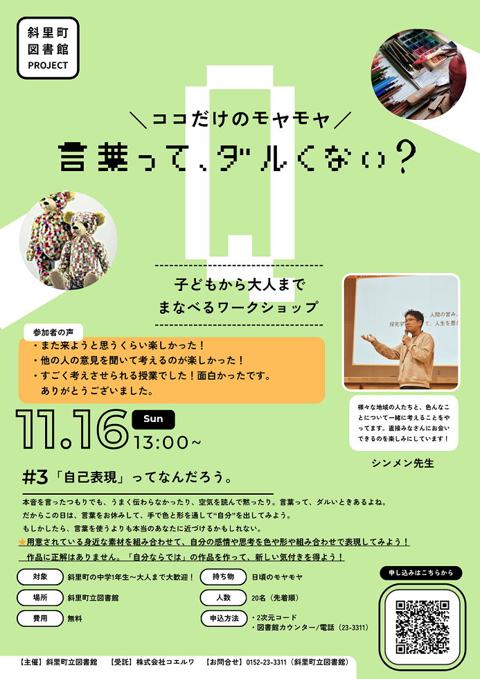 しゃりまなび場を開催している株式会社コエルワのシンメン先生と一緒に、自分ならではの作品づくりで自分を見つめ直してみませんか?
