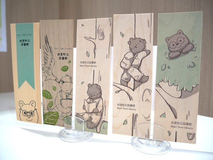 新しいしおりは白樺素材で、図書館キャラクター・斜里ほん太の新しいイラストが描かれています。3つのしおりは縦につながる絵柄になっているので、ぜひ3つ集めてみてください。